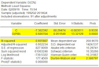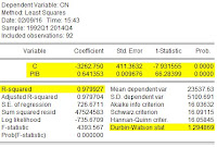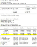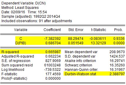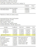 La constante n’est pas significative pour la série de la consommation nationale (C=0 dans le schéma), puisque la p-value associée à est supérieure au seuil critique de 0,05 avec 0,14. On conclut donc l’absence d’une tendance stochastique pour cette série. Pour le cas de la série du PIB, la constante est significativement différente de 0, puisque la p-value associé à est inférieur 0,05 le seuil critique. A côté de cette constante on a la présence d’une racine unitaire, en fait, le processus autorégressif de ce processus est tester par , la p-value associé à ce coefficient est égale à 0,08. On accepte donc l’hypothèse de non stationnarité du processus et on procède à sa différenciation. Pour la série de la consommation natioanle, on procède au test du processus autorégressif de la série ou comme appelé communément Random Walk à travers le modèle 1 .