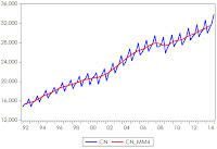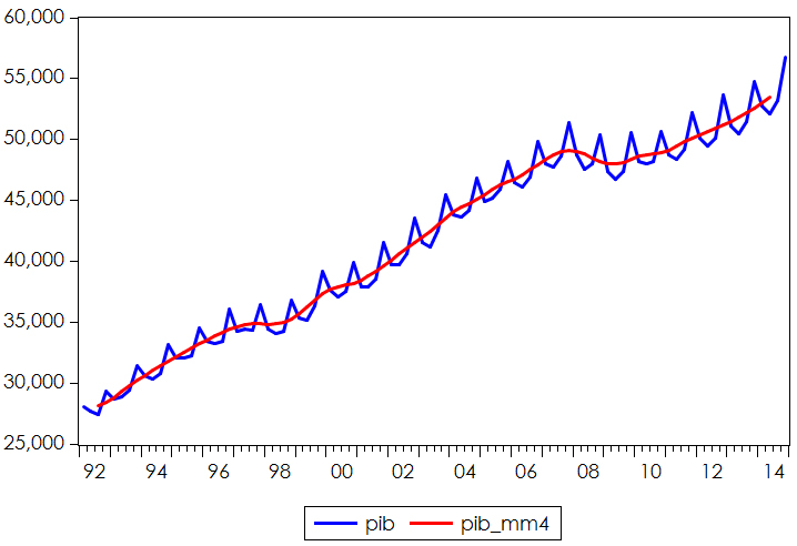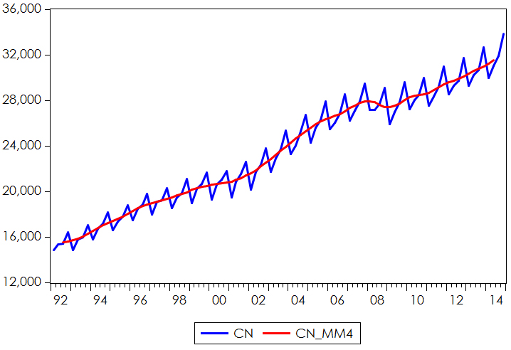 Commande sur Eviews : genr series = @movav(cn01,4)