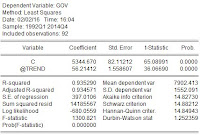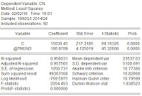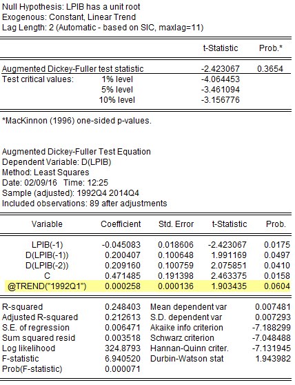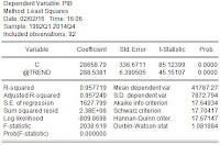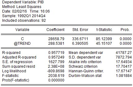A l’aide de Eviews 9, on estime la tendance de la série du PIB, pour ce faire, on régresse notre série sur le temps (1, 2, 3,…,T) et une constante. Les résultats de cette estimation sont résumés dans le tableau suivant :