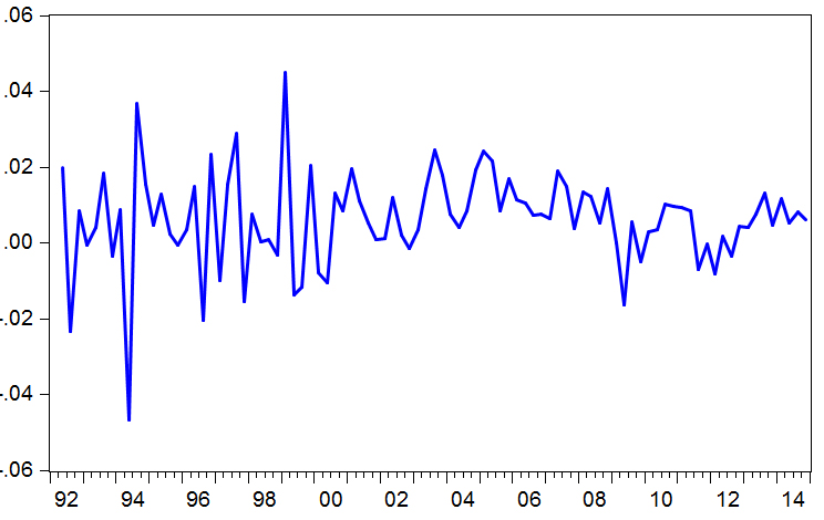 L’hypothèse nulle de ce test correspond à tester l’existence de racine unitaire dans le processus. Les résultats du test nous informe qu’on ne peut pas rejette l’hypothèse nulle d’existence de racine unitaire puisque la statistique de Augmented Dickey-Fuller calculée est supérieure à la valeur critique de la table ADF (8,24>-1,94). Les séries de la consommation nationale est par conséquent non stationnaire et suit un processus DS.