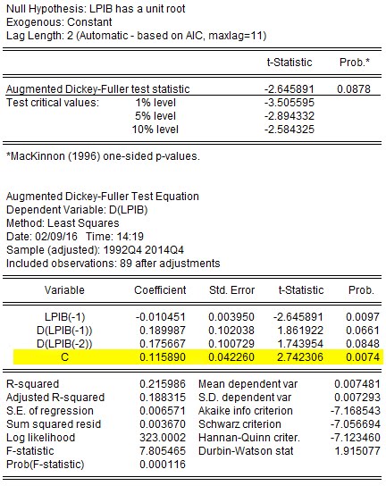 passons au deuxième modèle dans lequel on test l’existence d’une tendance